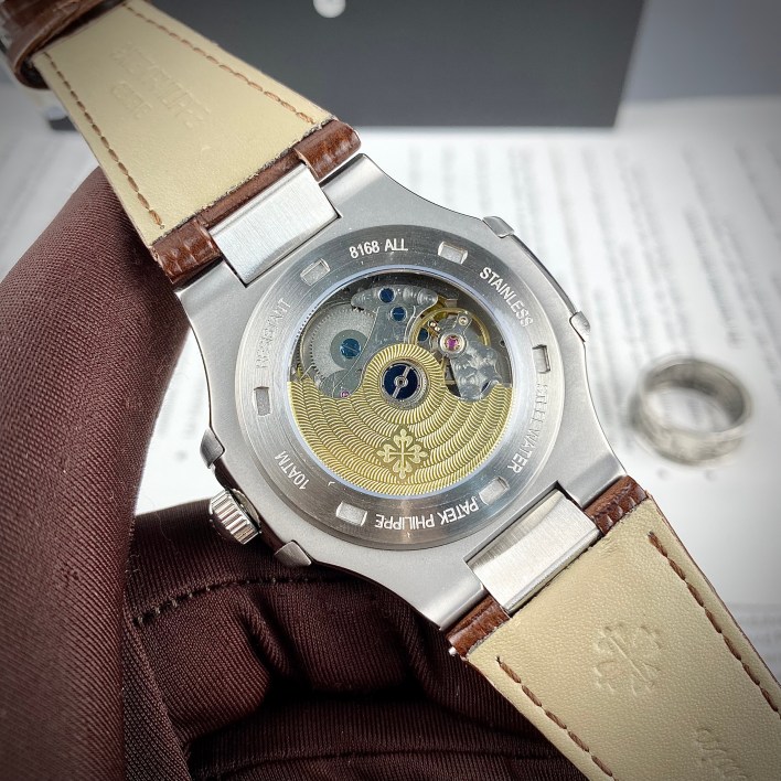 Đồng hồ Patek Philippe cơ lộ máy dây da màu nâu Super Fake 43mm