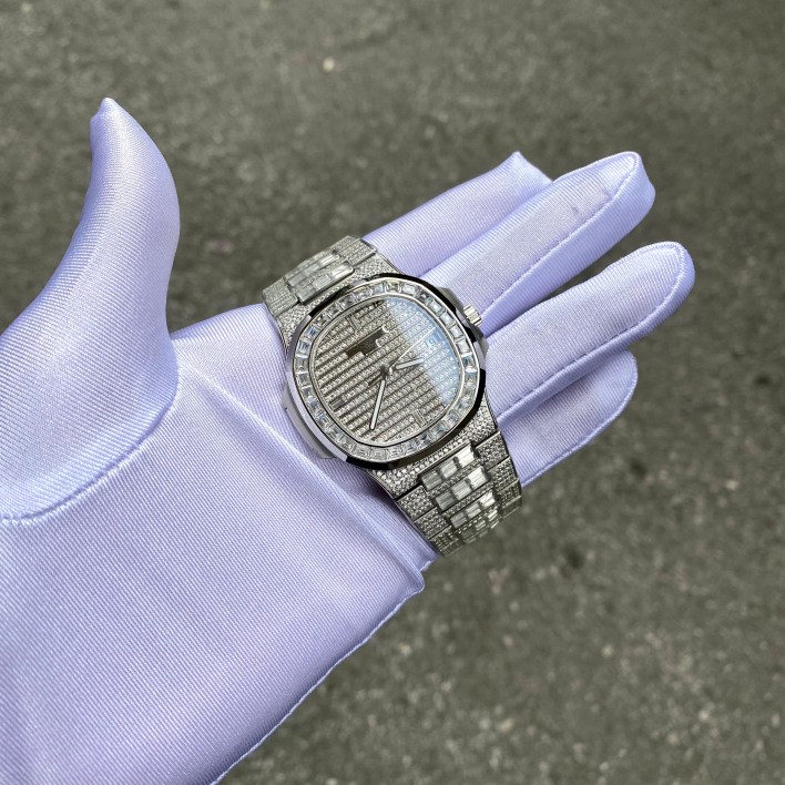 Đồng hồ Patek Philippe Nautilus Full Diamonds nam Replica 1:1Theo như chúng ta đang thấy ở đây. Toàn bộ chiếc đồng hồ này được đính toàn bộ 100% bằng kim cương nhân tạo rất là đẹp và sáng. Những viên kim cương được gắn chấu 4 cạnh rất chắc chắn. Với độ bắt sáng ở mức cao mang lại cho chiếc đồng hồ sự lấp lánh, sang trọng. Đó chính là đặc điểm nổi bật nhất của kim cương nhân tạo Mozambique so với các kim cương thông thường. Không chỉ có phần vỏ case mà cả mặt dial hay toàn bộ phần dây đều được đính full kim cương. Nếu bạn đeo chiếc đồng hồ trên tay xin đảm bảo rằng : Bạn sẽ luôn là tâm điểm chú ý và sự ngưỡng mộ của mọi người.!