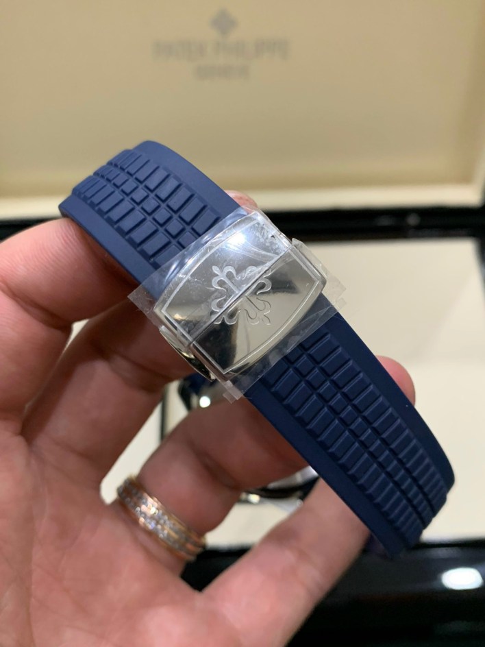 Để cố định bộ dây, Patek Philippe Aquanaut sử dụng cơ chế khóa bướm. Với logo thương hiệu được ghép lại ở chính giữa. Nếu người dùng có cổ tay nhỏ, có thể cắt bớt phần dây cao su thừa sao cho phù hợp. Tuy nhiên, thao tác này chỉ được thực hiện một chiều. Và nếu sau này bạn muốn bán lại chiếc đồng hồ cho người có cổ tay lớn hơn thì chỉ có một cách duy nhất: mua bộ dây mới.